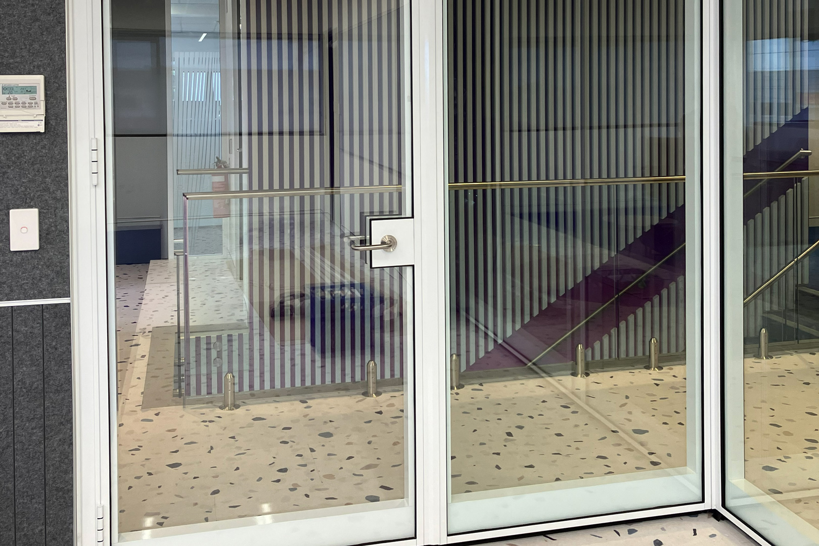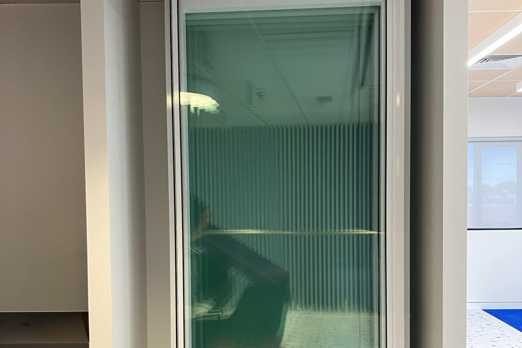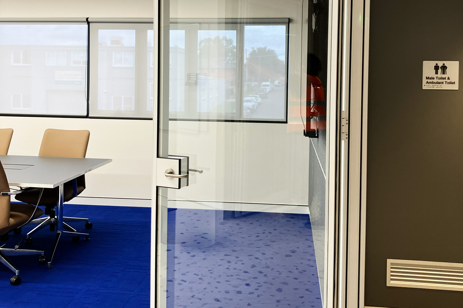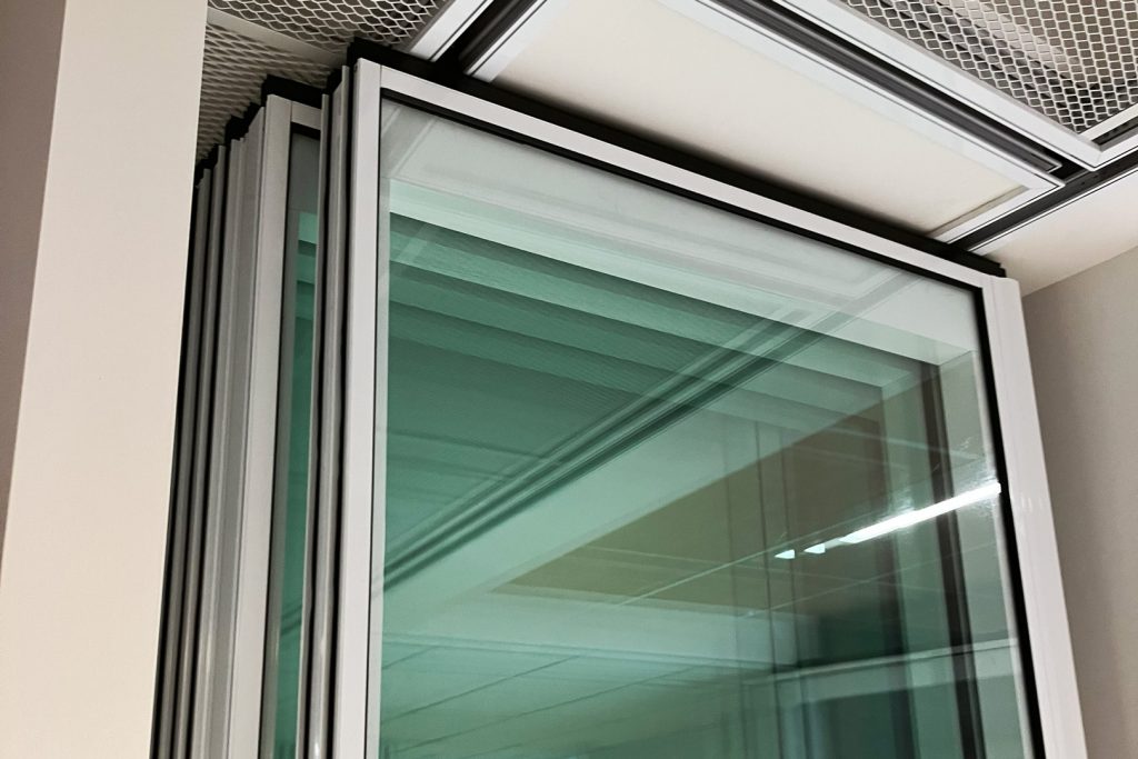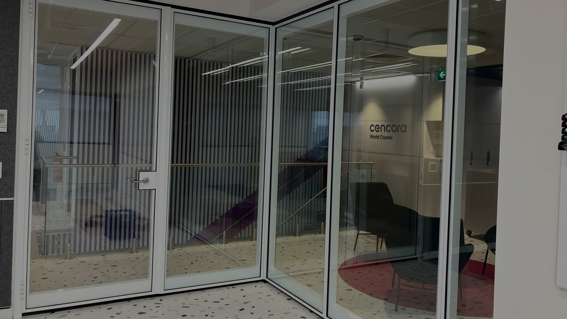 The Optica operable wall installed for Cencora World Courier features (5) panels, including a door closure with lever handle, in a remote stack configuration. This is a Rw47 glazed operable wall.